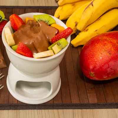 Fondue de Chocolate Belga, servido com frutas da estação em embalagem térmica de 150 ml.